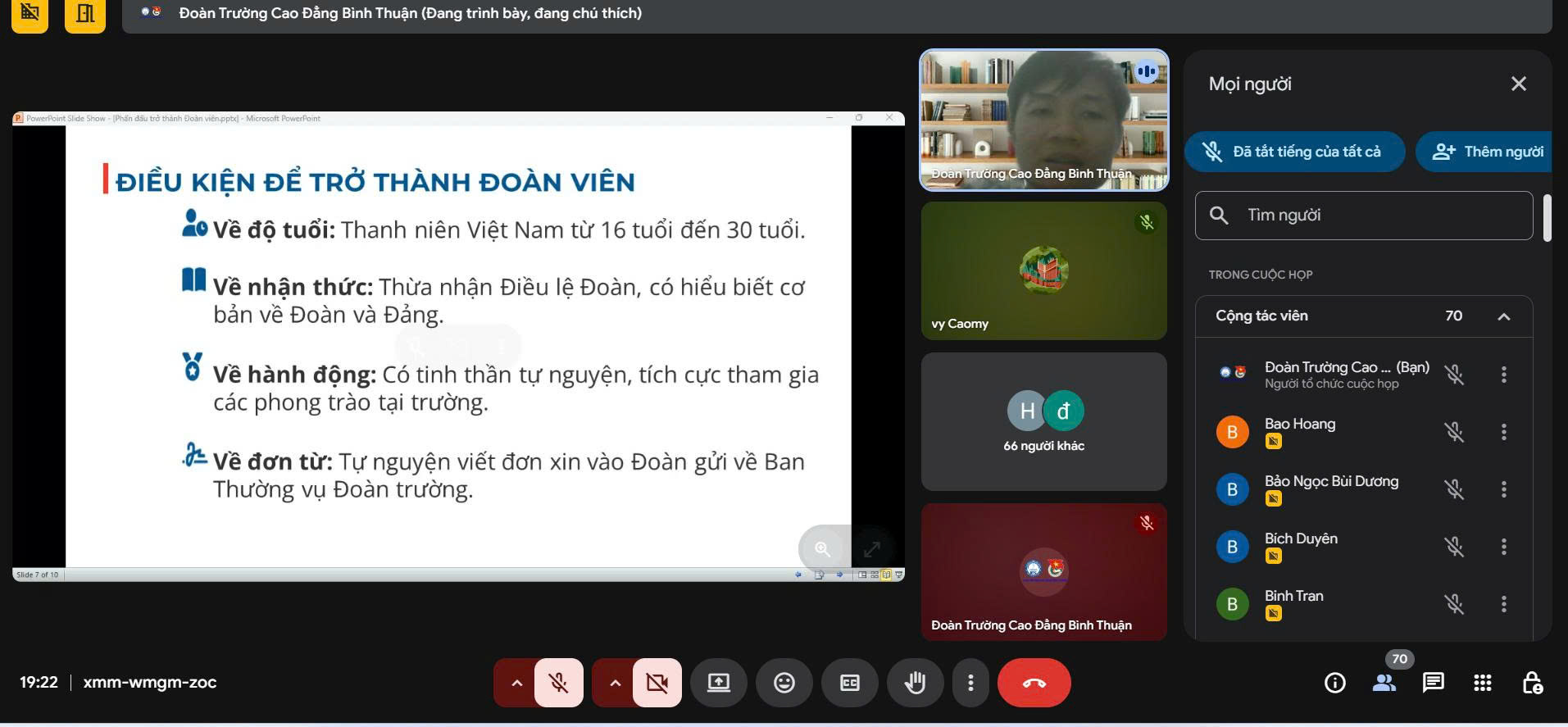 Nhằm bồi dưỡng nhận thức chính trị, lý tưởng cách mạng và nâng cao hiểu biết về tổ chức Đoàn cho thanh niên ưu tú, trong năm học 2025–2026, Đoàn Trường Cao đẳng Bình Thuận đã tổ chức lớp cảm tình Đoàn trực tuyến dành cho các thanh niên tiên tiến vào ngày 20/3/2026.