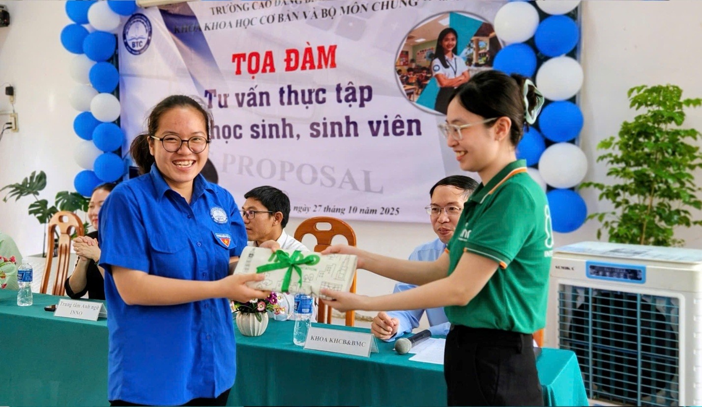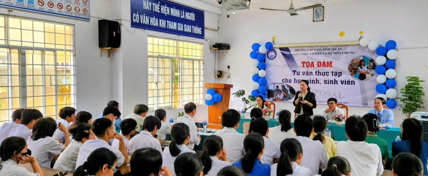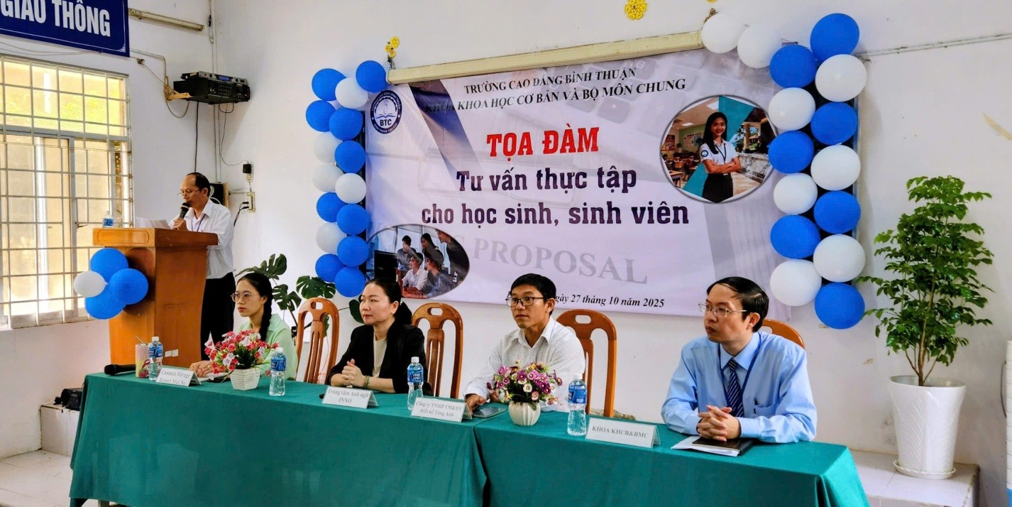 Thực hiện Kế hoạch số 18/KH-CĐBT ngày 26/02/2025 của Hiệu trưởng Trường Cao đẳng Bình Thuận về Tọa đàm tư vấn thực tập cho học sinh, sinh viên - năm 2025, được sự đồng ý của Ban Giám hiệu Nhà Trường, sáng ngày 27/10/2025, Khoa Khoa học cơ bản và Bộ môn chung đã tổ chức buổi tọa đàm giao lưu định hướng thực tập nghề nghiệp dành cho học sinh, sinh viên năm thứ 2 và năm thứ 3.
