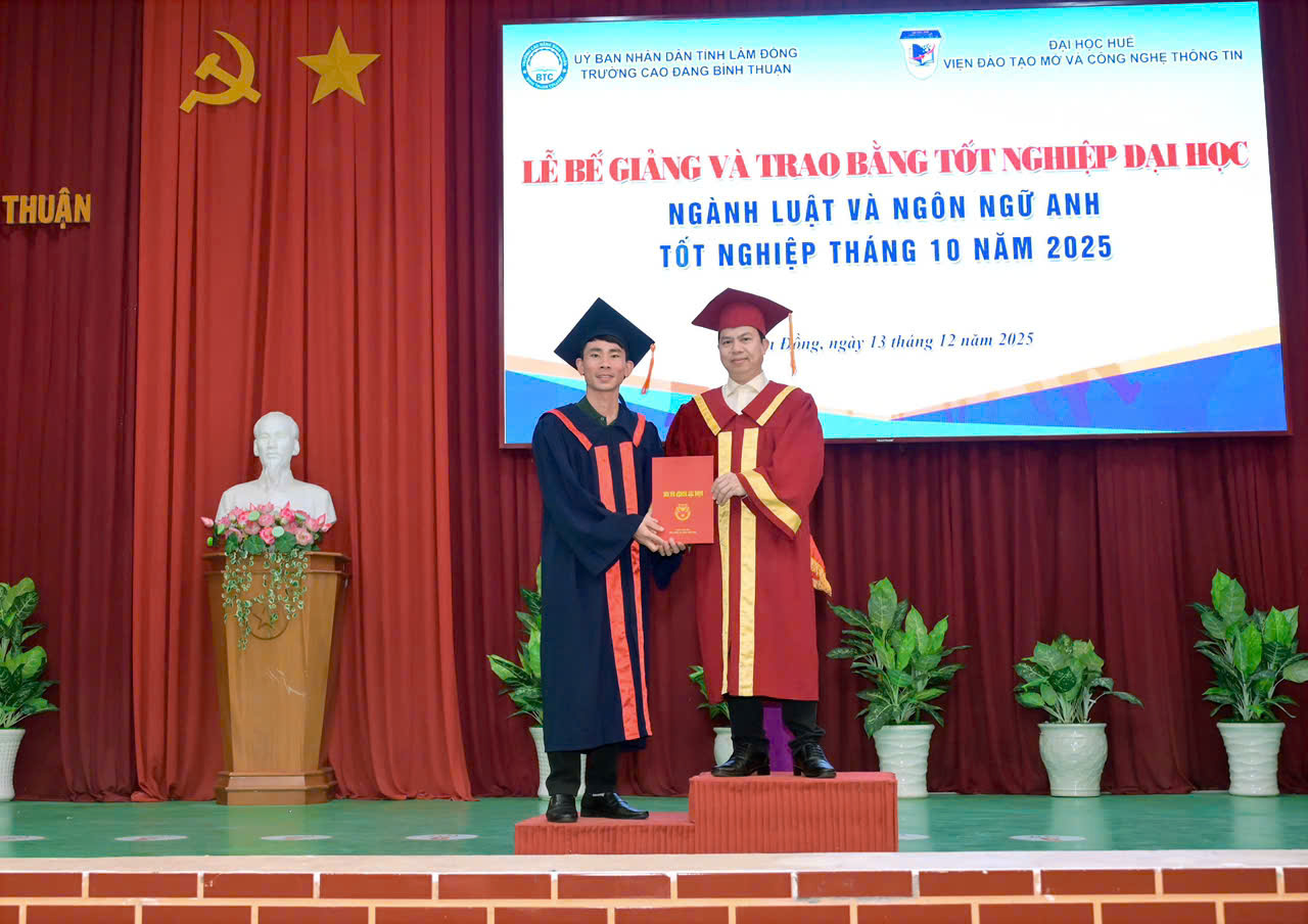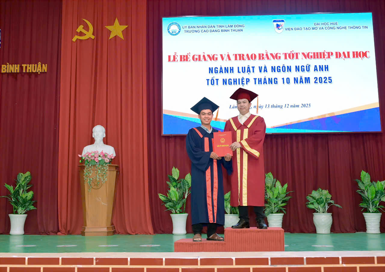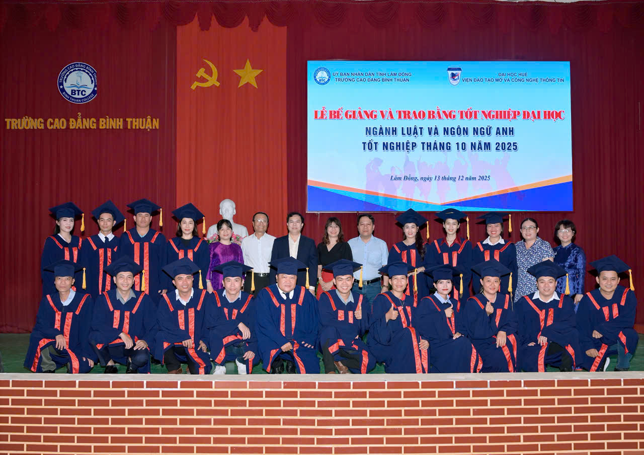 Chiều ngày 13/12/2025, trong không khí trang trọng, Trường Cao đẳng Bình Thuận phối hợp cùng Viện Đào tạo mở và Công nghệ thông tin – Đại học Huế long trọng tổ chức Lễ Bế giảng và trao bằng tốt nghiệp đại học các lớp ngành Luật và Ngôn ngữ Anh hệ đào tạo từ xa tại Hội trường Cơ sở 1.