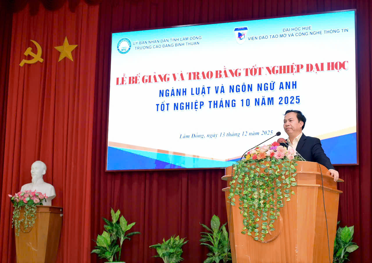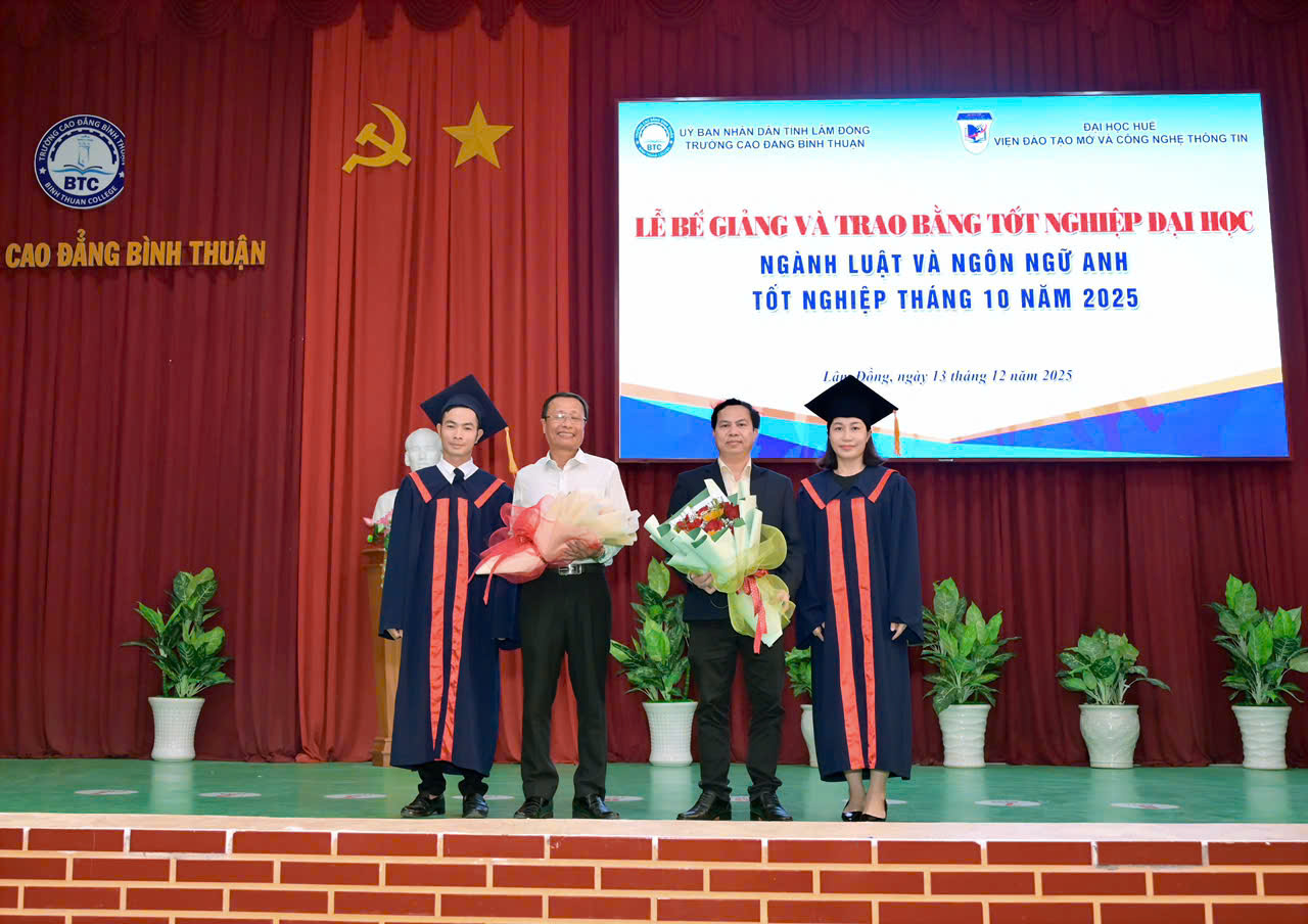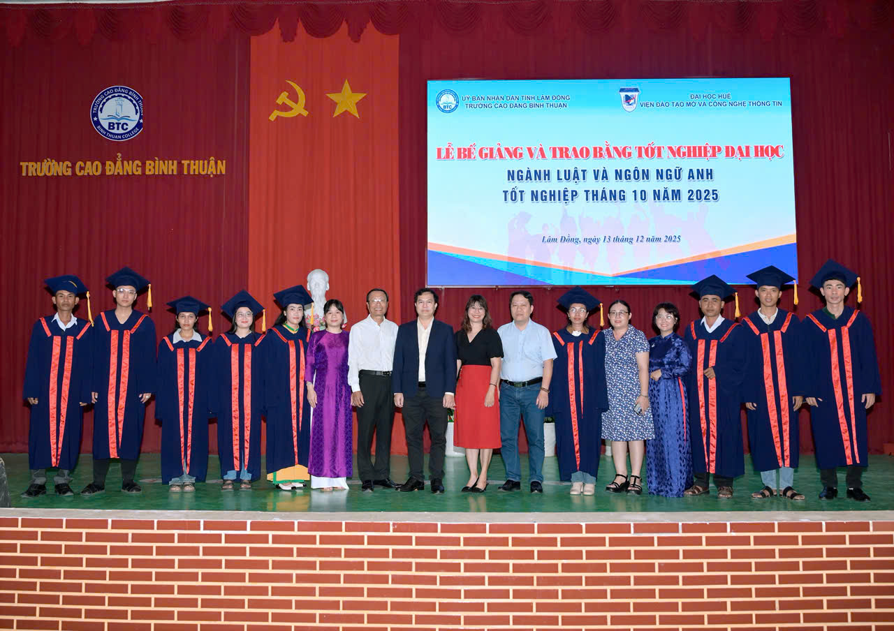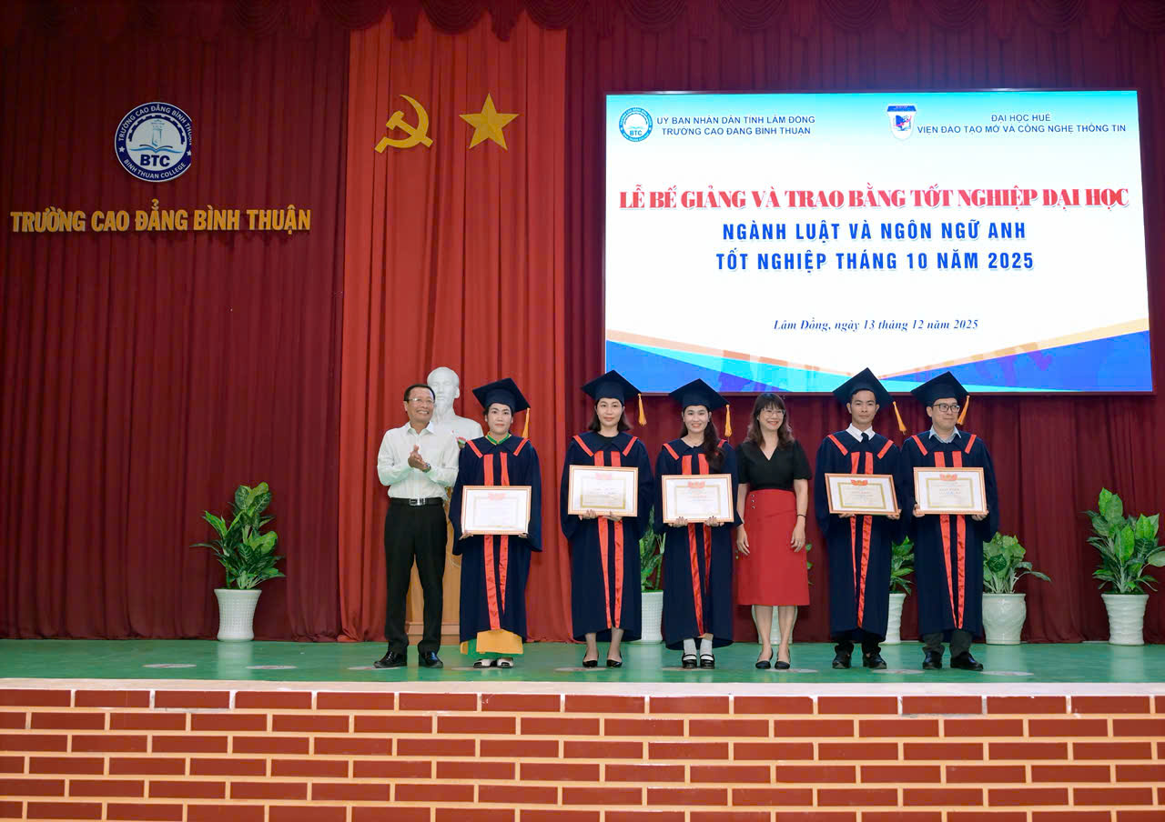 Chiều ngày 13/12/2025, trong không khí trang trọng, Trường Cao đẳng Bình Thuận phối hợp cùng Viện Đào tạo mở và Công nghệ thông tin – Đại học Huế long trọng tổ chức Lễ Bế giảng và trao bằng tốt nghiệp đại học các lớp ngành Luật và Ngôn ngữ Anh hệ đào tạo từ xa tại Hội trường Cơ sở 1.