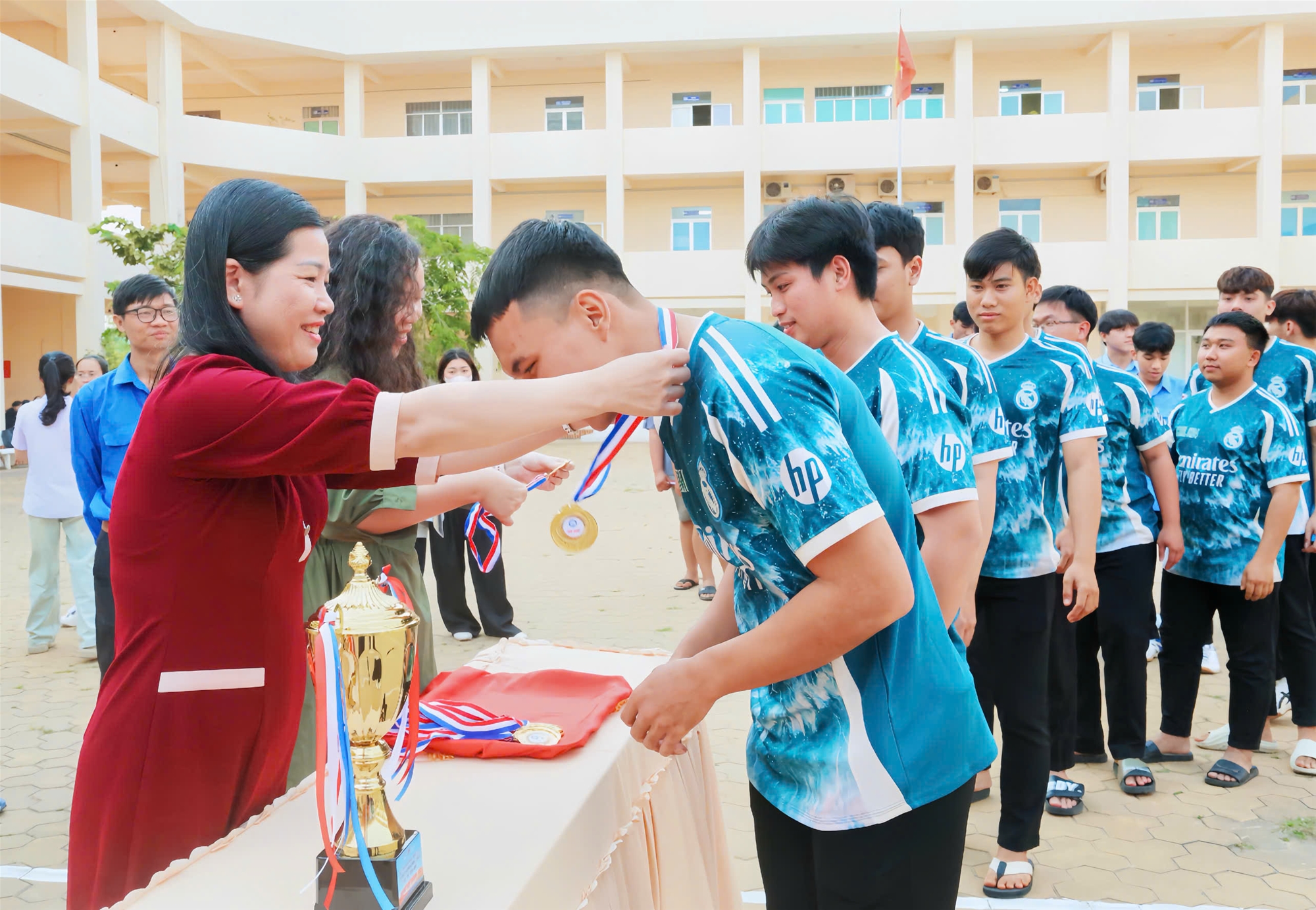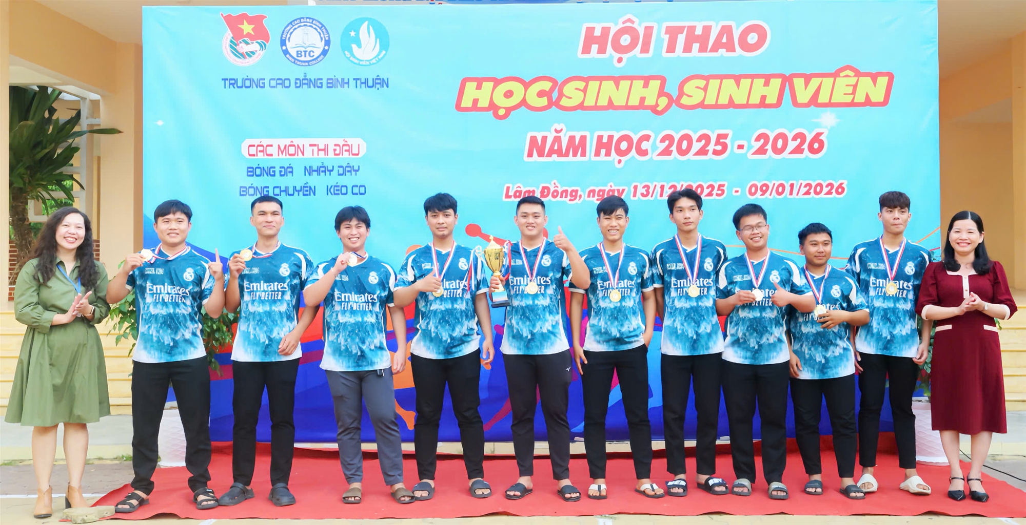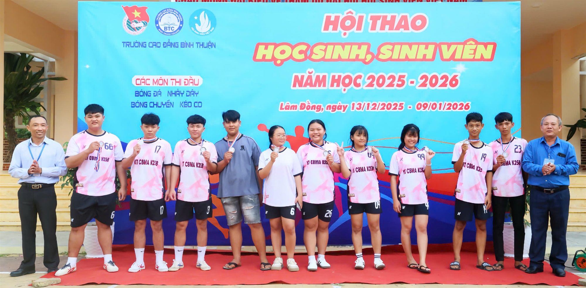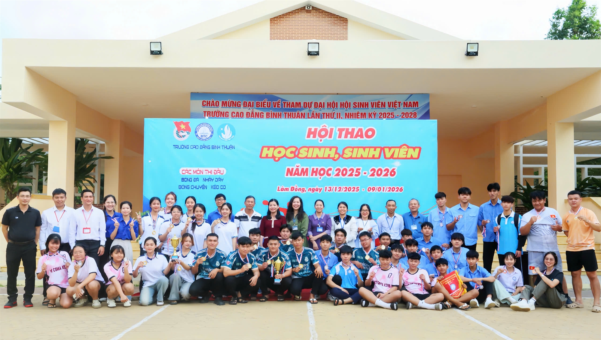 Hòa trong không khí thi đua sôi nổi kỷ niệm 81 năm Ngày thành lập Quân đội nhân dân Việt Nam (22/12/1944 - 22/12/2025), 76 năm Ngày truyền thống học sinh, sinh viên và Hội Sinh viên Việt Nam (09/01/1950 - 09/01/2026) và chào đón năm mới 2026, chiều ngày 09/01/2026, tại sân trường - Cơ sở 1, Trường Cao đẳng Bình Thuận đã long trọng tổ chức Lễ bế mạc và trao giải Hội thao Học sinh, sinh viên năm học 2025 - 2026.