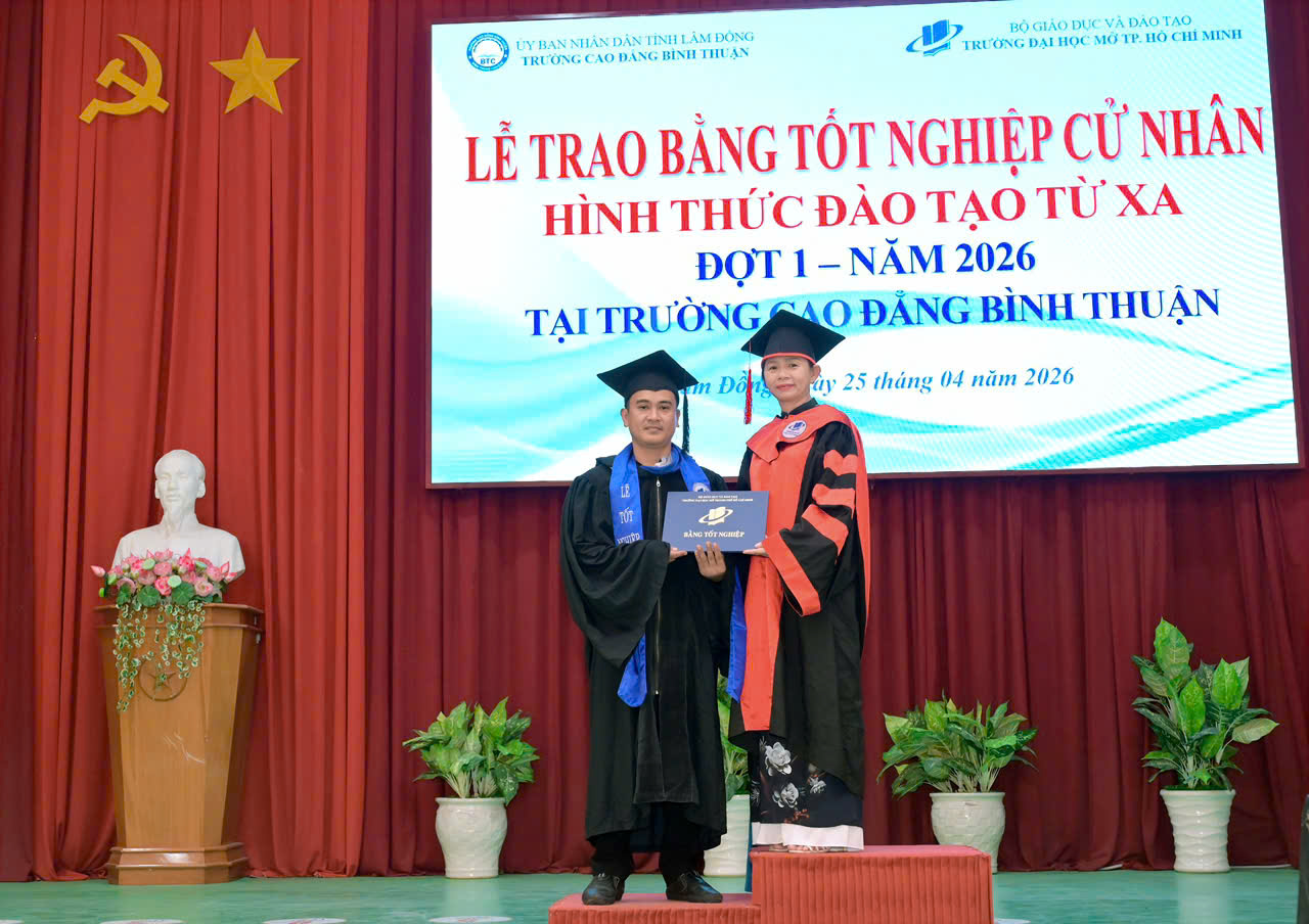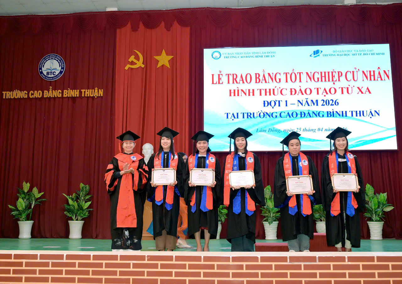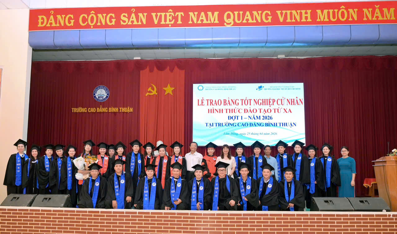 Sáng ngày 25/4/2026, tại Cơ sở 1, Trường Cao đẳng Bình Thuận đã long trọng tổ chức Lễ trao bằng tốt nghiệp cử nhân hình thức đào tạo từ xa đợt 1 năm 2026 cho 33 tân cử nhân các ngành Luật, Quản trị kinh doanh và Kế toán.