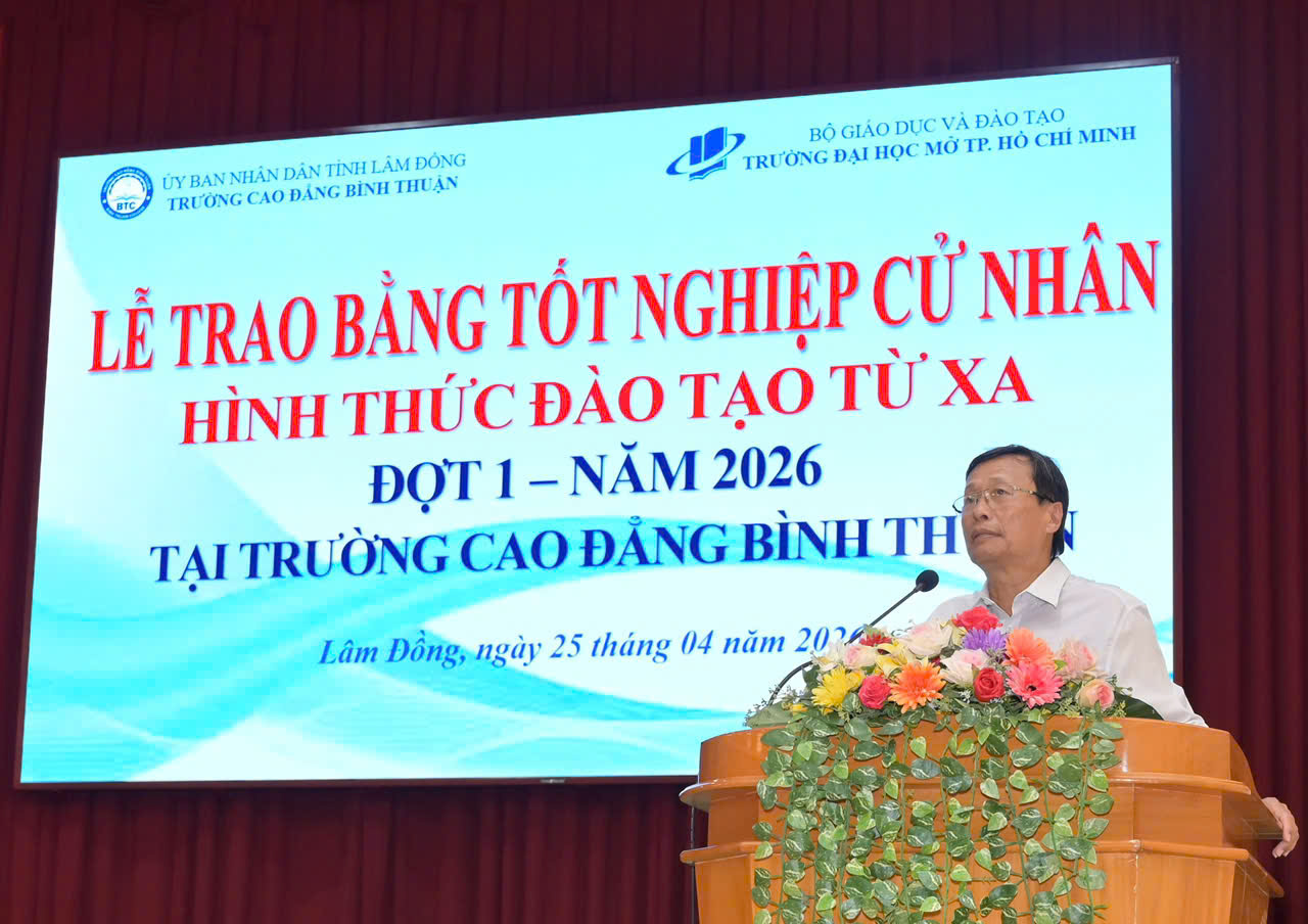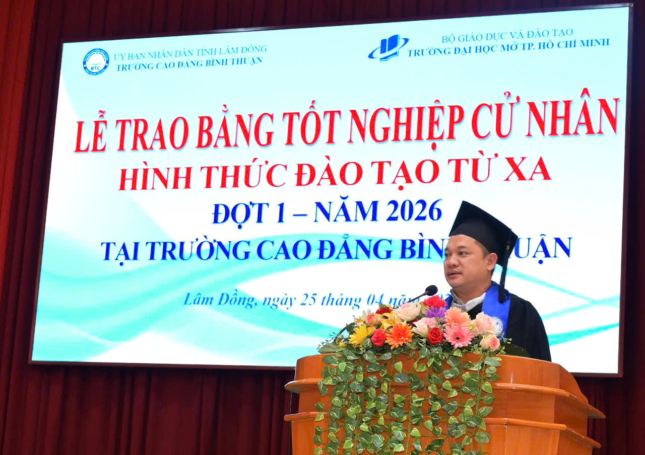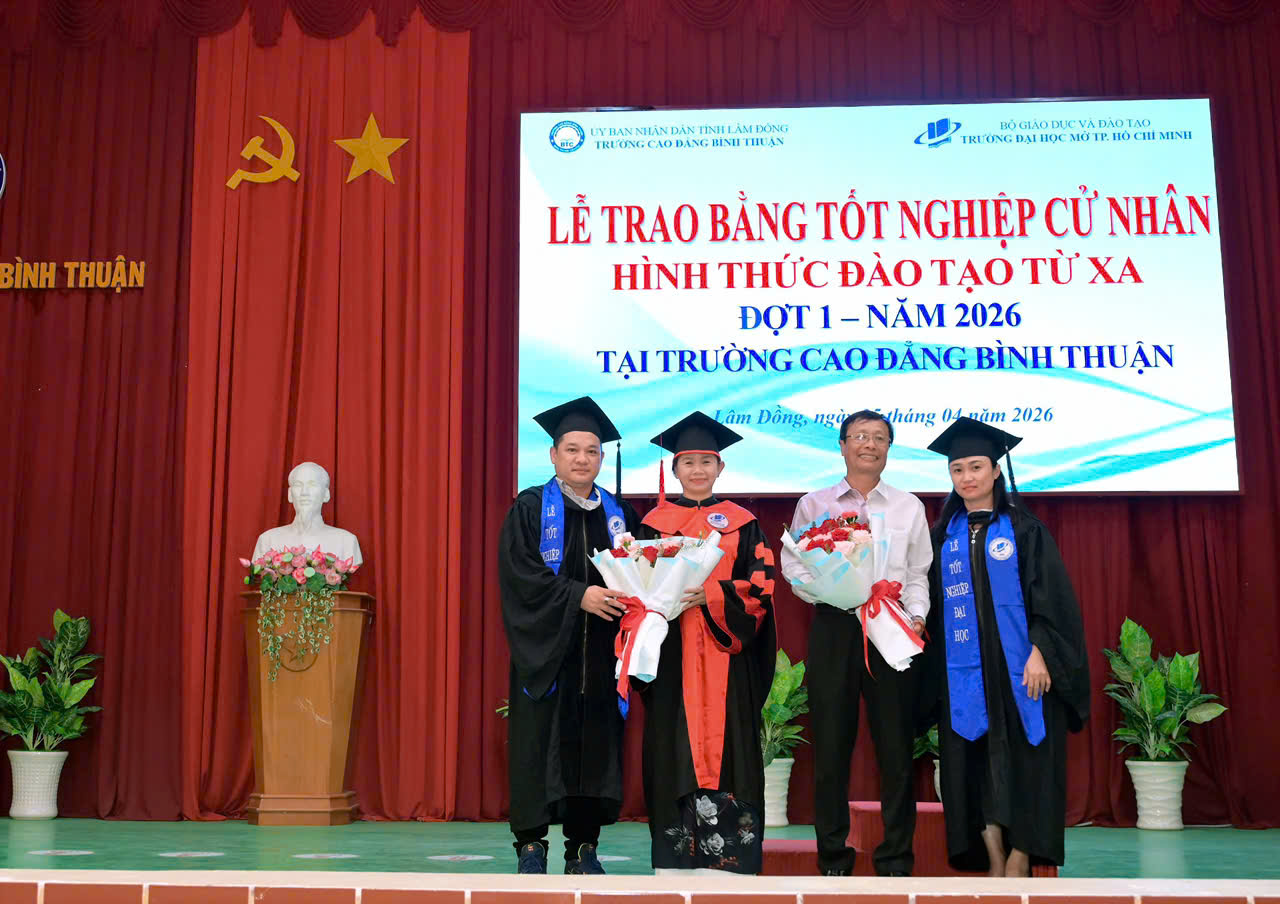 Sáng ngày 25/4/2026, tại Cơ sở 1, Trường Cao đẳng Bình Thuận đã long trọng tổ chức Lễ trao bằng tốt nghiệp cử nhân hình thức đào tạo từ xa đợt 1 năm 2026 cho 33 tân cử nhân các ngành Luật, Quản trị kinh doanh và Kế toán.