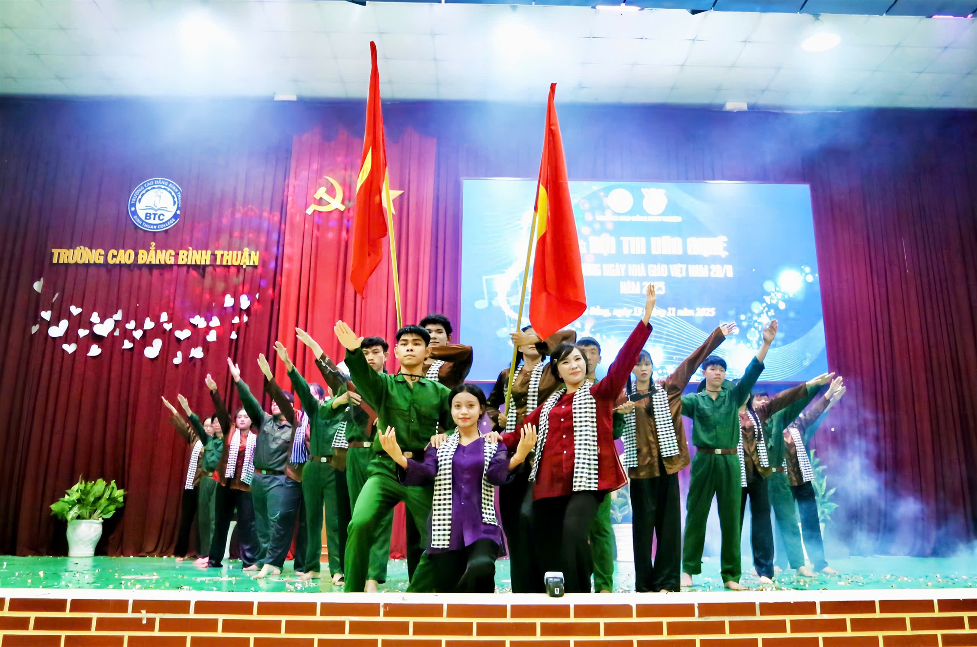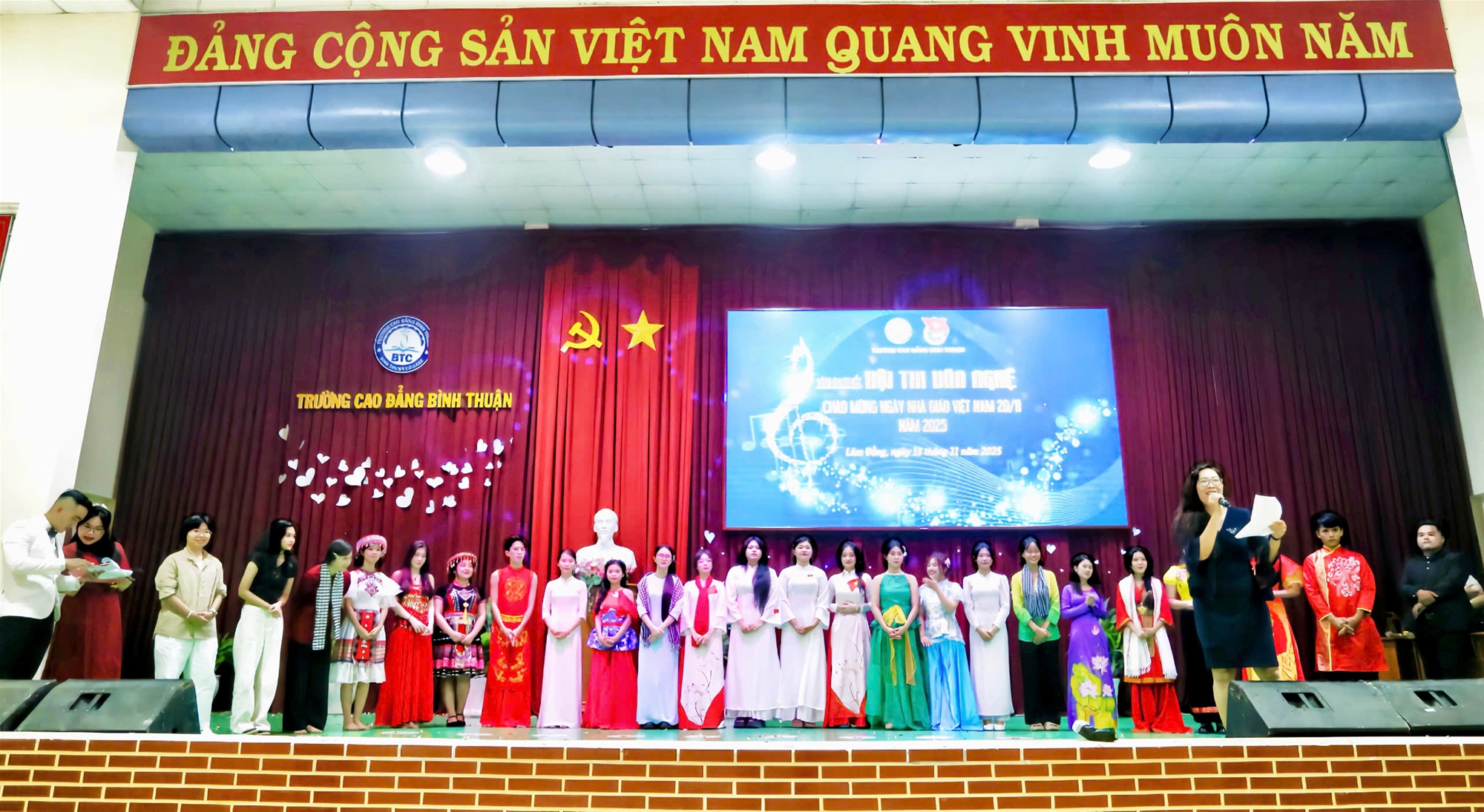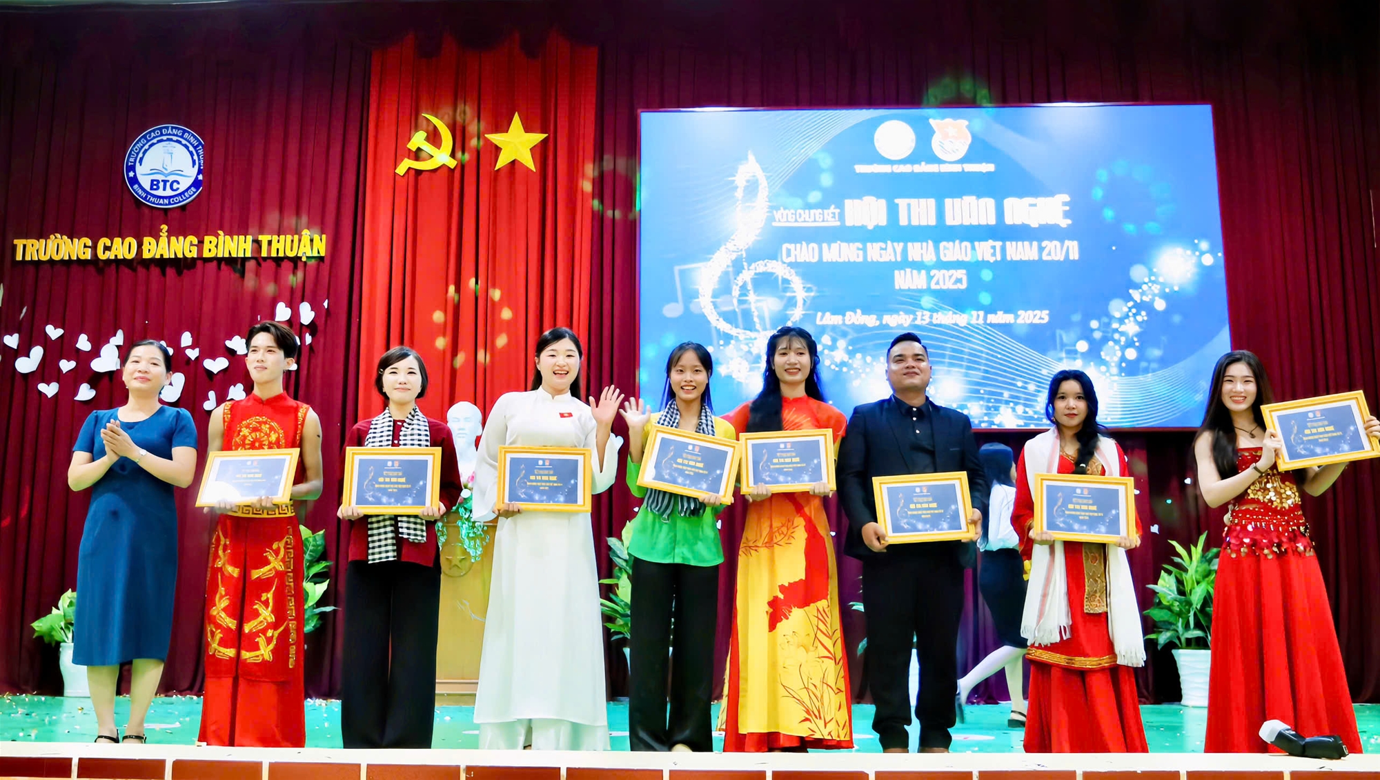 Hòa chung không khí thi đua sôi nổi lập thành tích chào mừng năm học mới 2025 - 2026 và kỷ niệm 43 năm ngày Nhà giáo Việt Nam (20/11/1982 - 20/11/2025), tối ngày 13/11/2025, tại Hội trường Cơ sở 1, Trường Cao đẳng Bình Thuận tổ chức vòng chung kết Hội thi văn nghệ “Chào mừng ngày Nhà giáo Việt Nam 20/11” năm 2025. Tham dự Hội thi có quý thầy cô trong Đảng ủy, Ban Giám hiệu, lãnh đạo các đơn vị, đoàn thể, viên chức, người lao động và đông đảo học sinh, sinh viên.