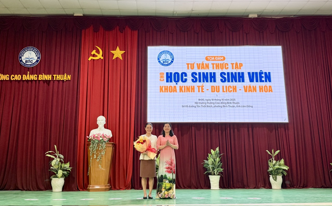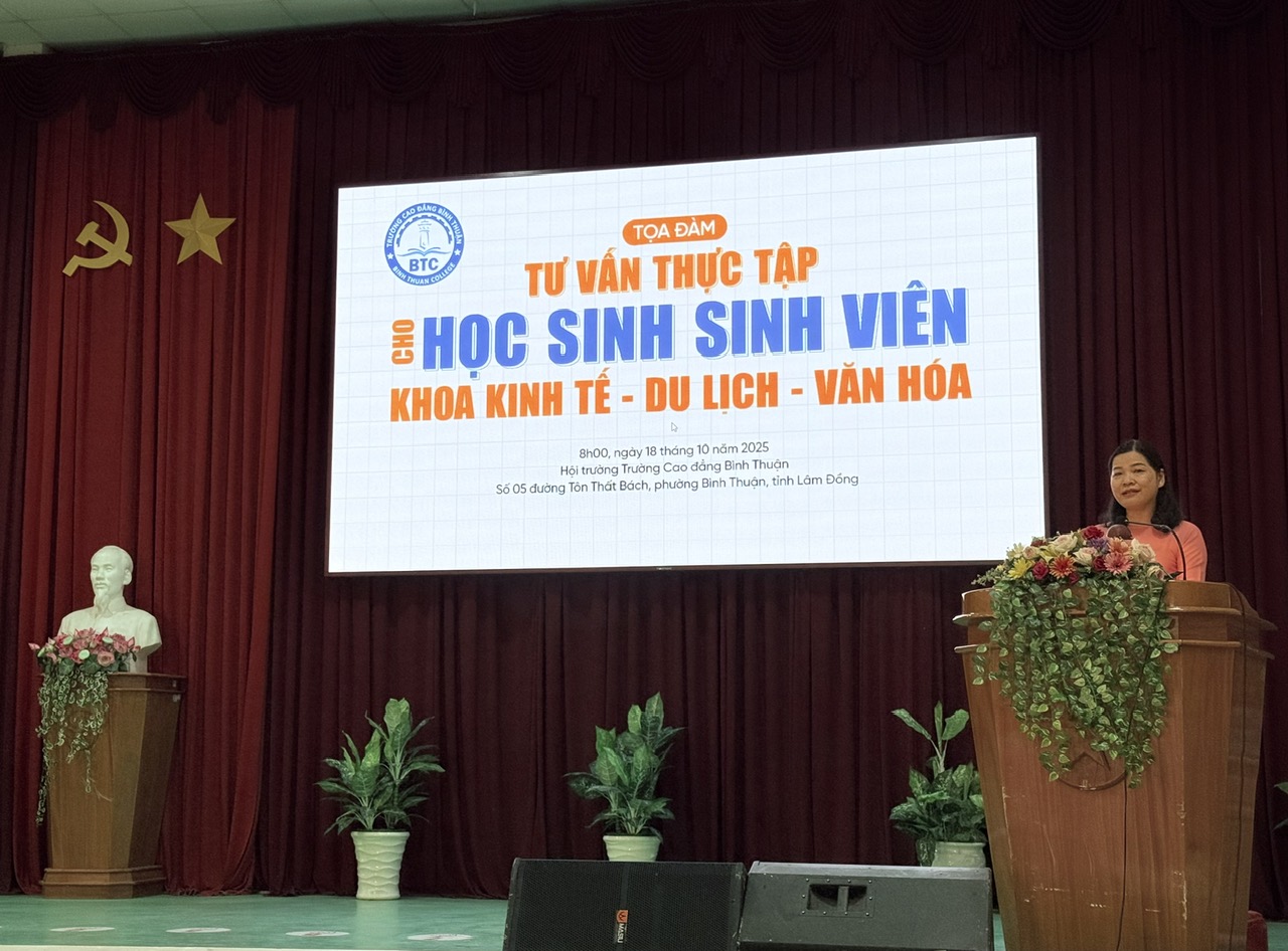 Sáng ngày 18/10/2025, tại Hội trường cơ sở 1 Trường Cao đẳng Bình Thuận, Chương trình tọa đàm tư vấn kỹ năng và định hướng thực tập cho học sinh, sinh viên (HSSV) các lớp khóa 23 và 24 Khoa Kinh tế - Du lịch - Văn hóa được tổ chức.