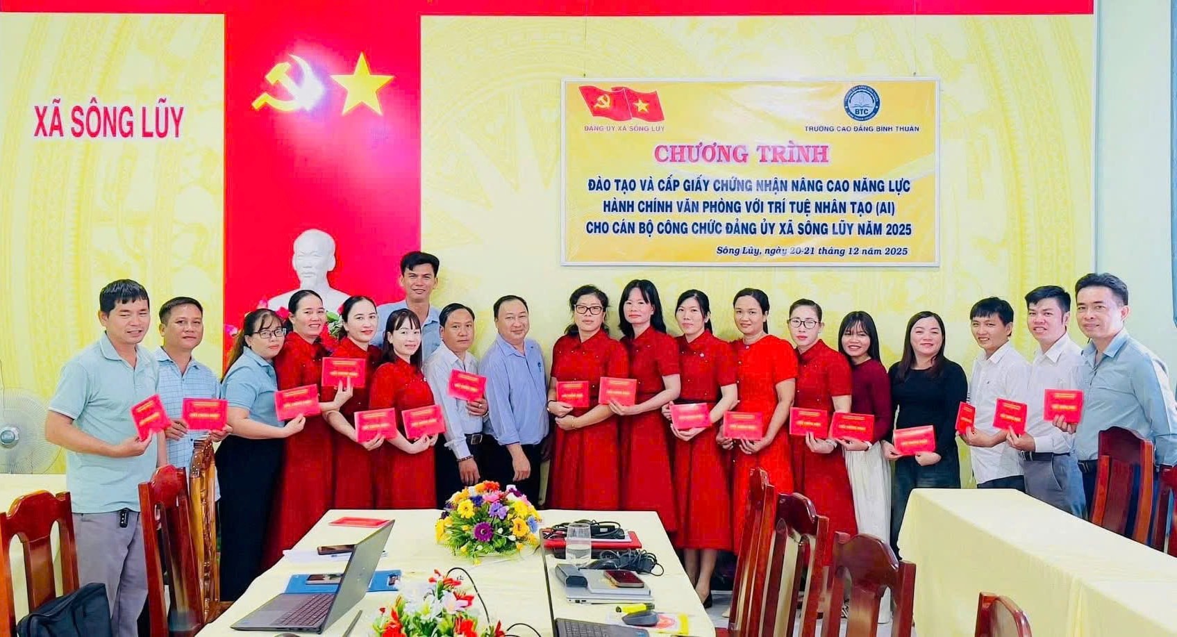 Sáng ngày 20/12/2025, tại Hội trường Đảng ủy Xã Sông Lũy, Trung tâm Ngoại ngữ - Tin học phối hợp với Đảng ủy Xã Sông Lũy đã tổ chức lễ khai giảng khóa bồi dưỡng nâng cao về ứng dụng Trí tuệ nhân tạo (AI) trong công tác hành chính văn phòng dành cho toàn thể đội ngũ cán bộ, công chức Đảng ủy Xã Sông Lũy, tỉnh Lâm Đồng.