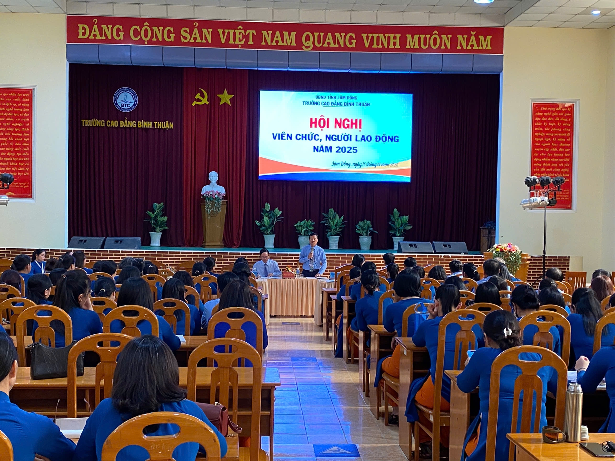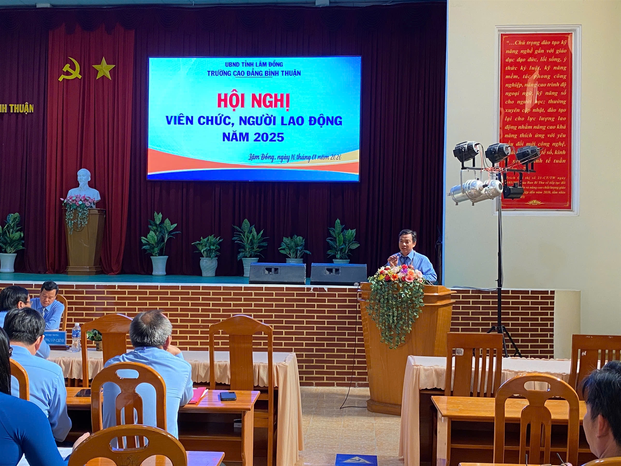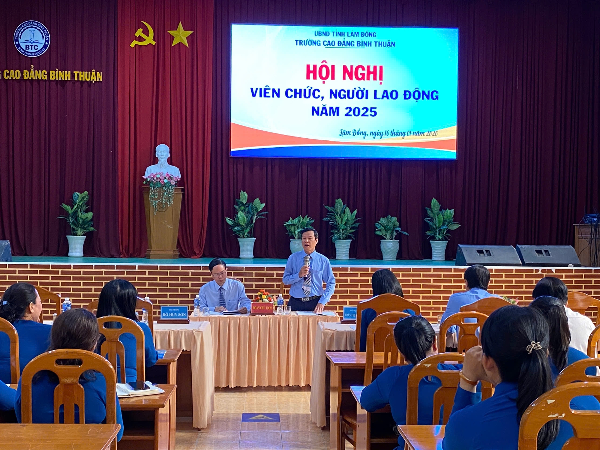 Thực hiện Luật Thực hiện dân chủ ở cơ sở năm 2022 và Nghị định số 59/2023/NĐ-CP ngày 14/8/2023 của Chính phủ quy định chi tiết một số điều của Luật Thực hiện dân chủ ở cơ sở, chiều ngày 16/01/2026, Trường Cao đẳng Bình Thuận tổ chức Hội nghị Viên chức, người lao động năm 2025. Hội nghị do đồng chí Đỗ Huy Sơn-Hiệu trưởng-Bí thư Đảng ủy cùng đồng chí Vũ Quang-Chủ tịch Công đoàn cơ sở Trường đồng chủ trì.