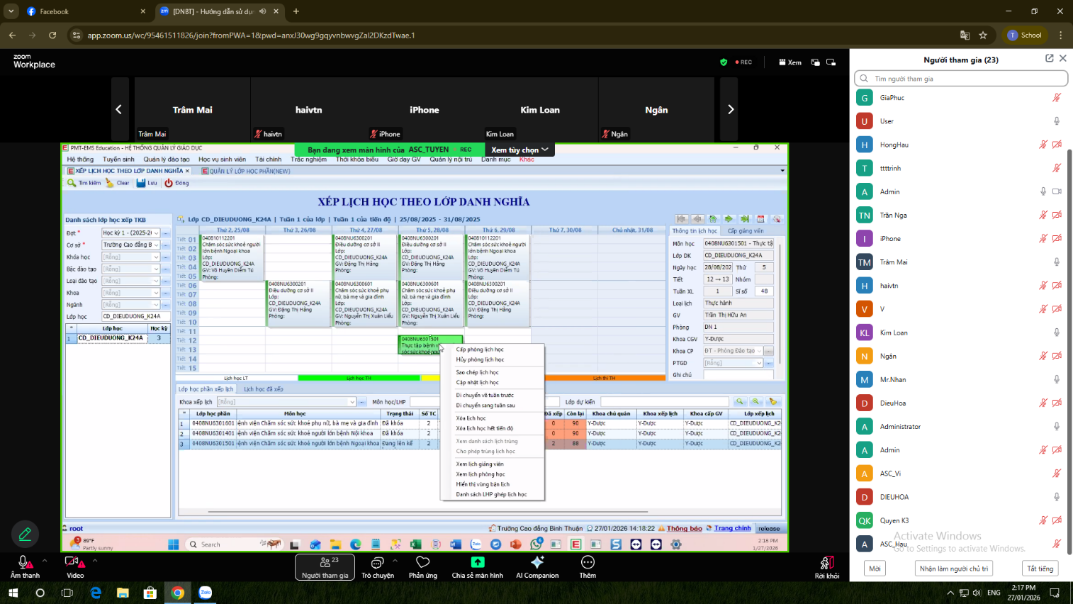 Trong thời gian từ ngày 26/01/2026 đến ngày 03/02/2026, Trường Cao đẳng Bình Thuận phôi hợp với Công ty ASC đã tổ chức thành công đợt tập huấn sử dụng các phân hệ phần mềm quản lý đào tạo PMT-EMS dành cho cán bộ, giảng viên và các đơn vị liên quan trong toàn trường. Đây là bước đi nhằm đồng bộ hóa dữ liệu và tối ưu hóa hiệu quả quản trị nhà trường trong kỷ nguyên số.