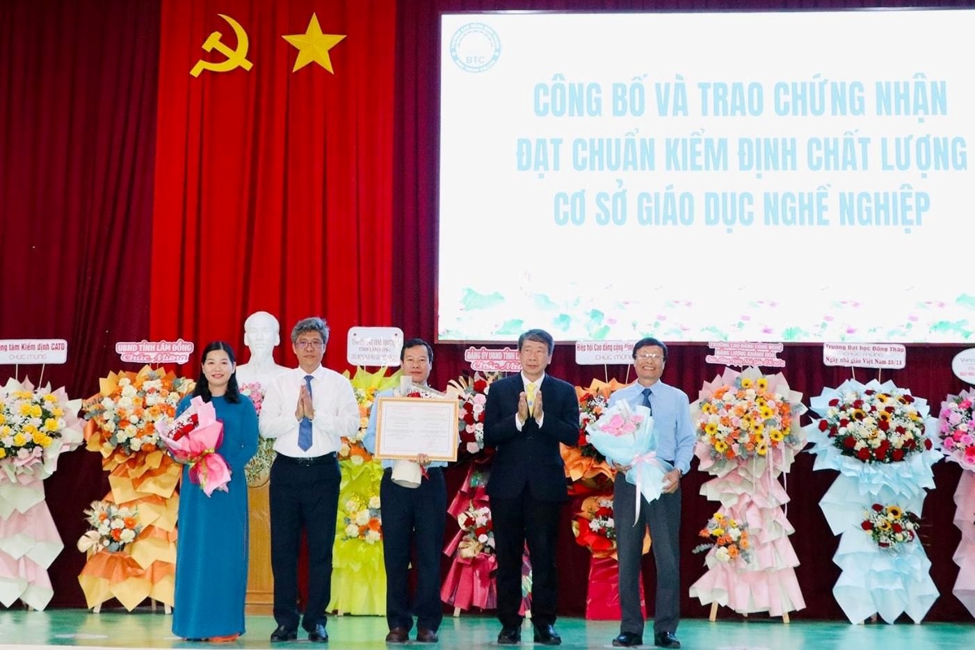 Tham dự chương trình, GS.TS Phạm Tiết Khánh - Chủ tịch Hiệp hội Cao đẳng Cộng đồng Việt Nam, Chủ tịch hội đồng Trường Đại học Trà Vinh đã thay mặt Trung tâm kiểm định CATD trao chứng nhận đạt tiêu chuẩn kiểm định chất lượng cơ sở giáo dục nghề nghiệp đối với Trường Cao đẳng Bình Thuận. Đạt chuẩn kiểm định chất lượng cơ sở giáo dục nghề nghiệp là một sự khẳng định vị thế của Trường Cao đẳng Bình Thuận trong việc nâng cao chất lượng đào tạo, tạo niềm tin đối với người học và cộng đồng.