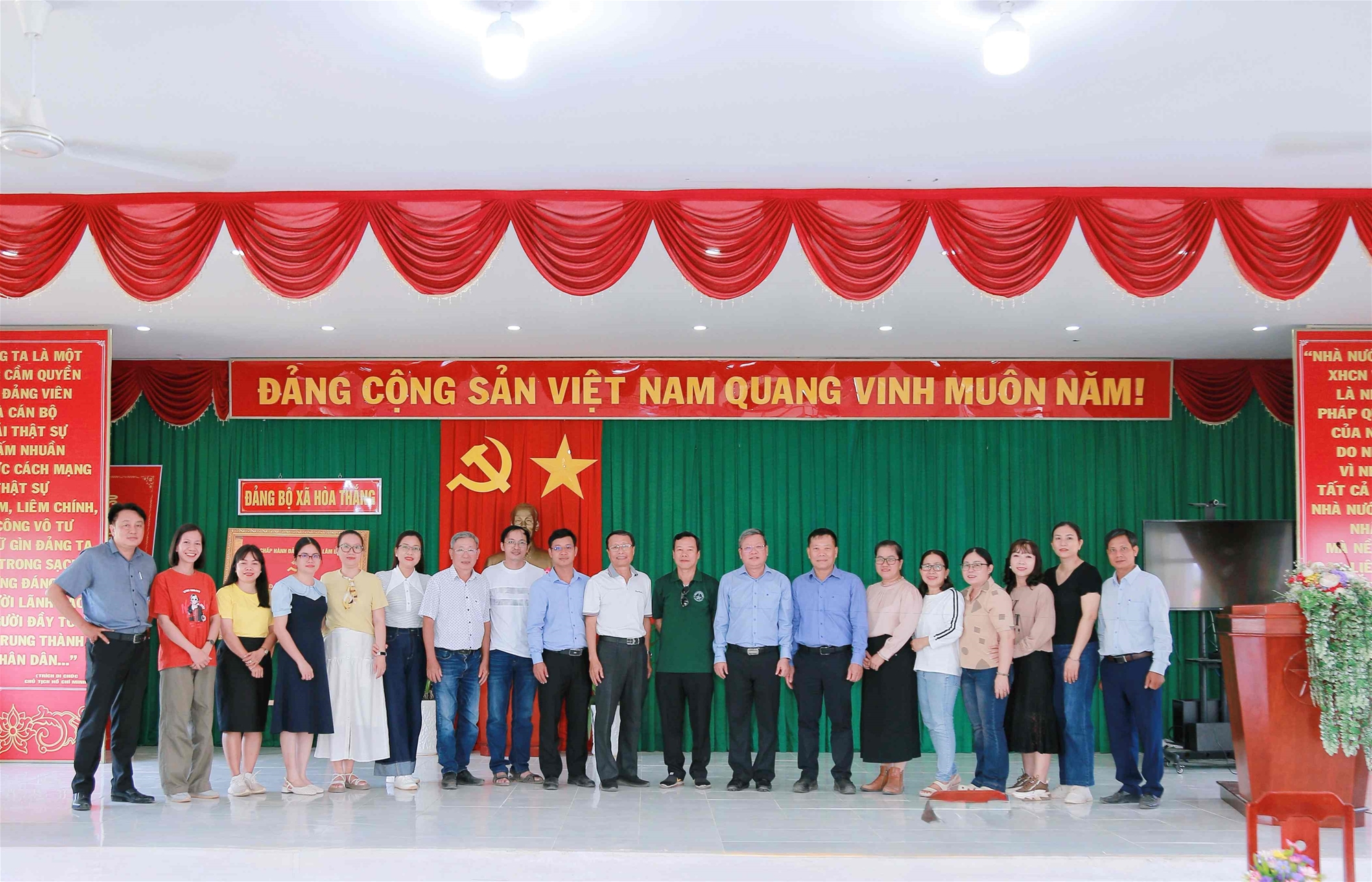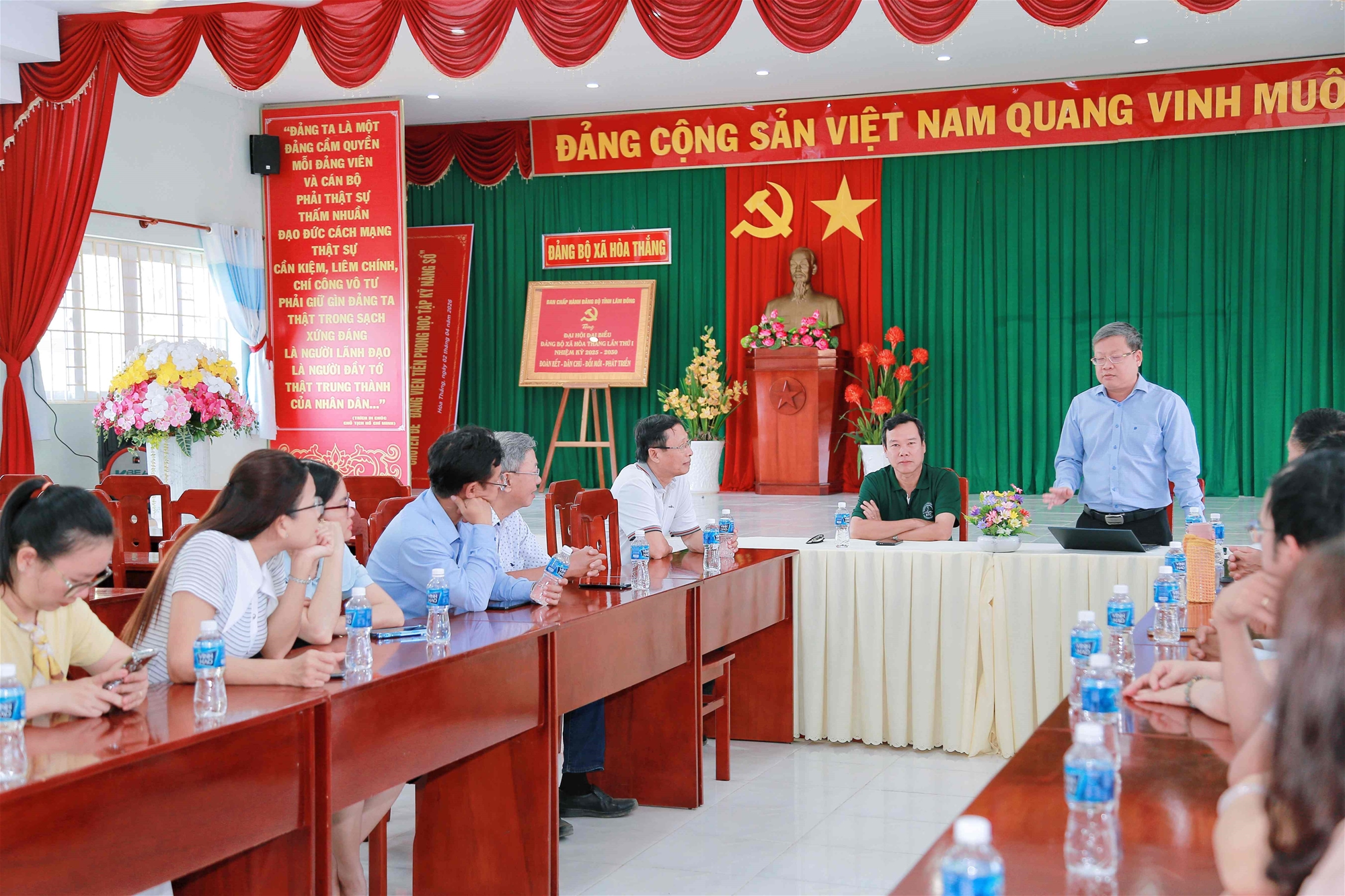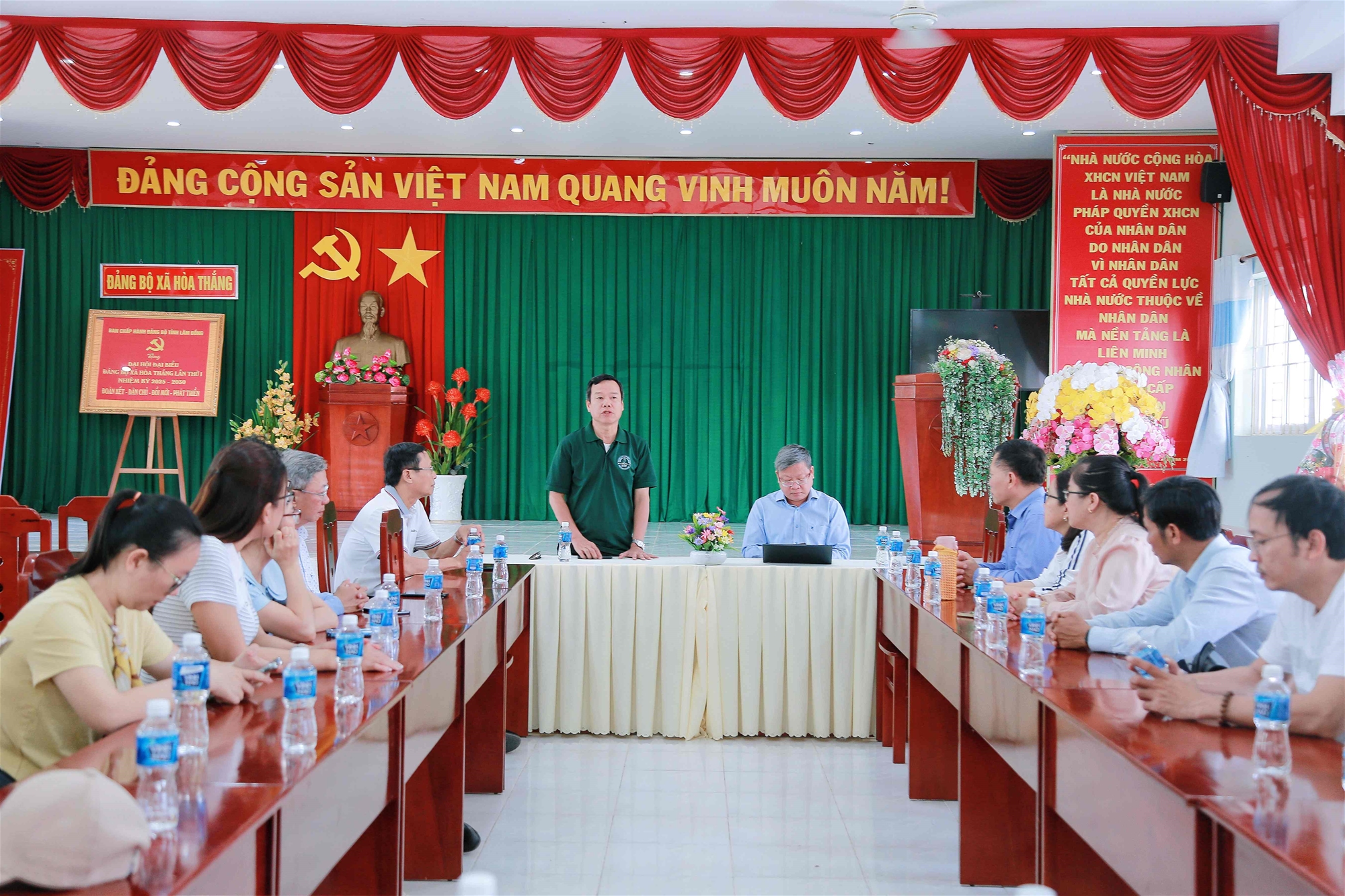 Tiếp đón đoàn tại Đảng ủy xã Hòa Thắng, trong buổi làm việc nghiêm túc và trách nhiệm, đoàn đã được đồng chí Nguyễn Đức Hải Tùng, Bí thư Đảng ủy, đại diện lãnh đạo địa phương trao đổi về tình hình phát triển kinh tế - xã hội, quốc phòng - an ninh trong thời gian qua. Qua đó giúp các đảng viên nắm bắt thực tiễn, nâng cao nhận thức và vận dụng hiệu quả vào công tác tại đơn vị.